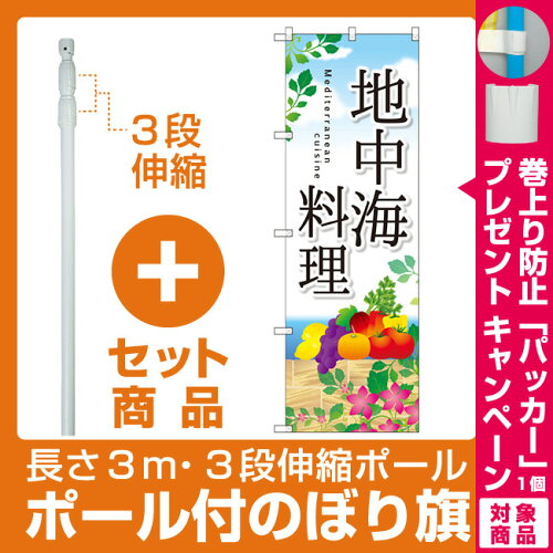 【プレゼント付】【セット商品】3m・3段伸縮のぼりポール(竿)付 のぼり旗 地中海料理 (SNB-2118)